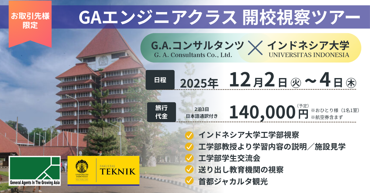 140,000円(おひとり様、1名1室)※税別 ※大学視察+学生交流会/ホテル/送迎車/食事/現地アテンド(日本人・現地スタッフ)/ジャカルタ半日ツアー込み |
